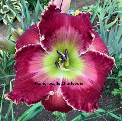 30-35 boutons floraux. Grande fleur pourpre avec halo et gorge verte à floraison répétée. Fertile dans les deux sens. |