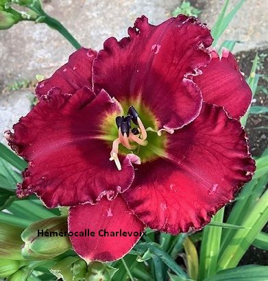 Grande fleur rouge cerise, halo rose, bordure frisée, cœur vert. Fertile. |