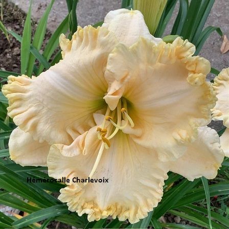 Grande fleur jaune avec bordure frisée, cœur vert. Fertile. |