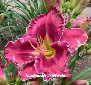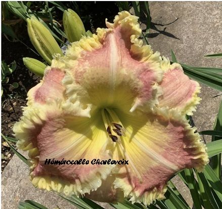 Superbe fleur rose, halo jaune, large bordure frisée dorée, coeur vert. Fertile dans les deux sens. GAGNANTE AAHQ 2025