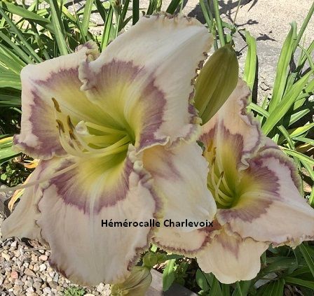 Grande fleur jaune crème avec halo fléché lilas, double bordure lilas et or, cœur vert. Fertile dans les deux sens.GAGNANTE AAHQ 2025