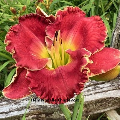 Fleur jaune intense, bordure frisée, coeur vert. Fertile dans les deux sens