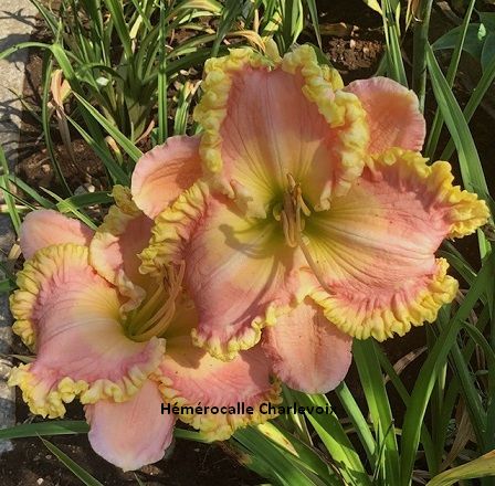 Fleur rose pâle, grand coeur dégradé de rose pâle et jaune, bordure dentelée jaune pâle, coeur jaune. Florifère et fertile |